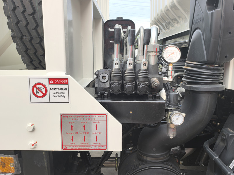 Сміттєвоз HOWO з поворотним важелем складається в основному з шасі, гідравлічної системи, механізму поворотного важеля та сміттєвого бака. Під час роботи водій керує гідравлічною системою для приводу поворотного важеля. Гак у передній частині поворотного важеля зачіпає вушка сміттєвого бака, плавно піднімаючи бак на платформу та надійно закріплюючи його.