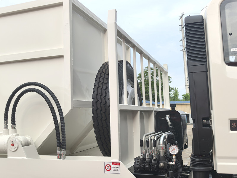 Сміттєвоз HOWO 4x2 з поворотним маневреним важелем може похвалитися міцною конструкцією, простим обслуговуванням та чудовою маневреністю, що дозволяє гнучко експлуатувати його в різних місцях, включаючи міські вулиці, житлові райони, підприємства, установи та будівельні майданчики. Його чудові герметичні властивості ефективно запобігають розсипанню та утворенню запаху під час транспортування сміття, мінімізуючи вторинне забруднення. Крім того, в транспортному засобі використовуються високоміцні матеріали та передові гідравлічні компоненти, що забезпечує довговічність та стійкість.