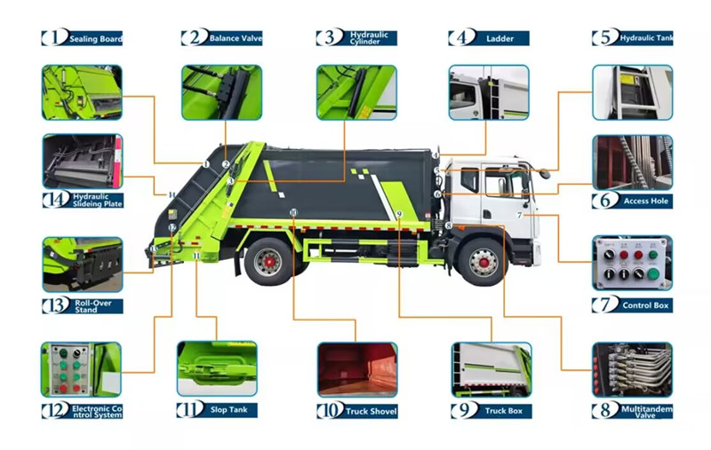 ●Задній компактор об'ємом 10 м³ складається в основному зі сміттєвого контейнера, навантажувача, компресійної плити, гідравлічної системи, електронної системи керування та заднього борту.