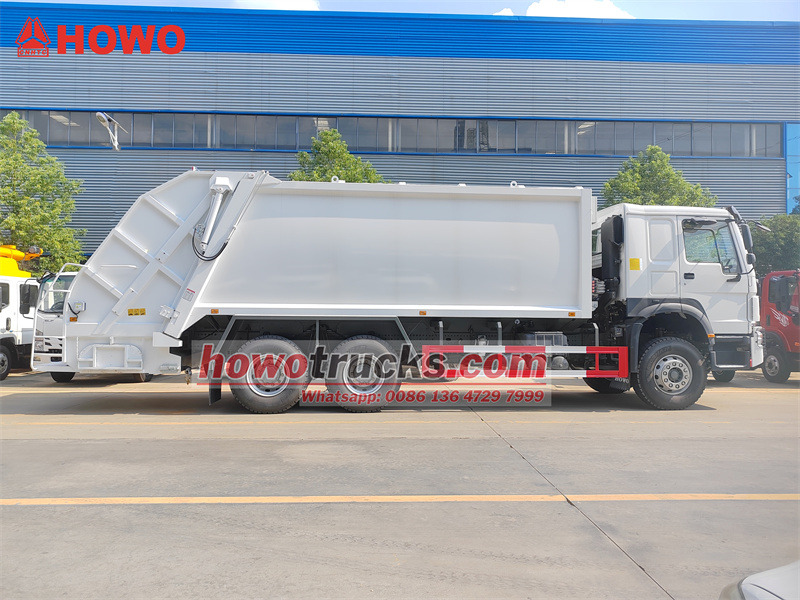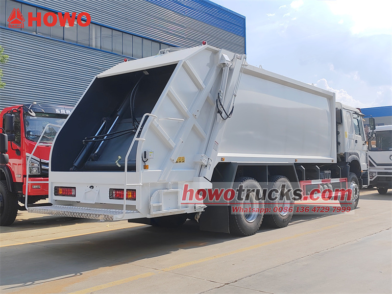 Сміттєвоз HOWO 6x4 із заднім навантажувачем 22 куб. м. модифікований на базі шасі Sinotruk HW76 6x4 з колісною базою 4600+1350 мм, двигуном Weichai WP10.340E22 та 10-ступінчастою коробкою передач Sinotruk HW19710. Верхня частина кузова являє собою дугоподібний компактор з вуглецевої сталі об'ємом 22 куб. м з антикорозійним та антикорозійним покриттям. Ззаду немає механізму відкидання, але є невелика платформа, на якій люди можуть стояти та скидати сміття. З обох боків заливної горловини є поручні, а збоку складані педалі. Завантаження та розвантаження сміття на цьому транспортному засобі контролюється електронною системою керування CAN-BUS, яка спеціально контролюється електронним блоком керування в кабіні, ручним гідравлічним важелем керування з боку водія та електронним блоком керування задніми дверима.