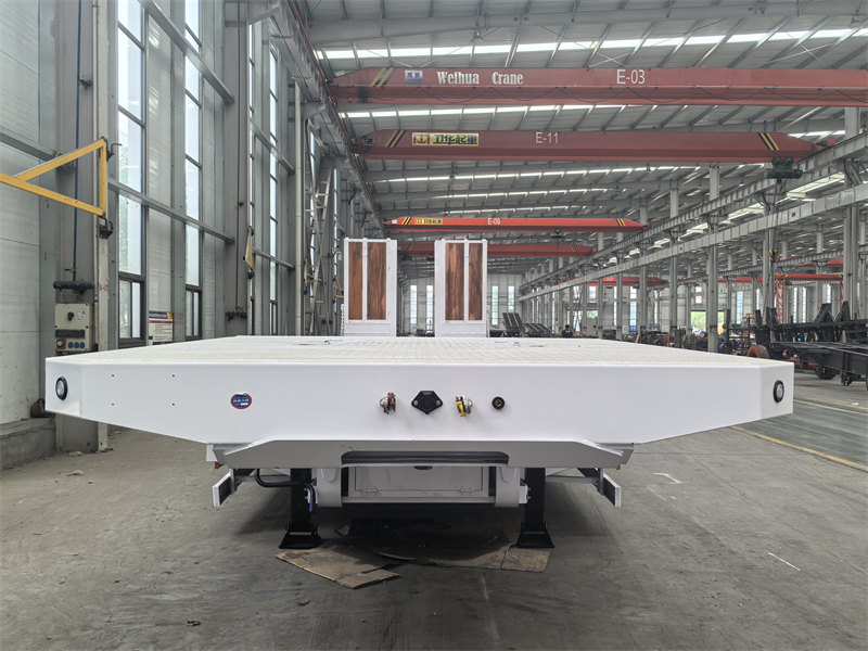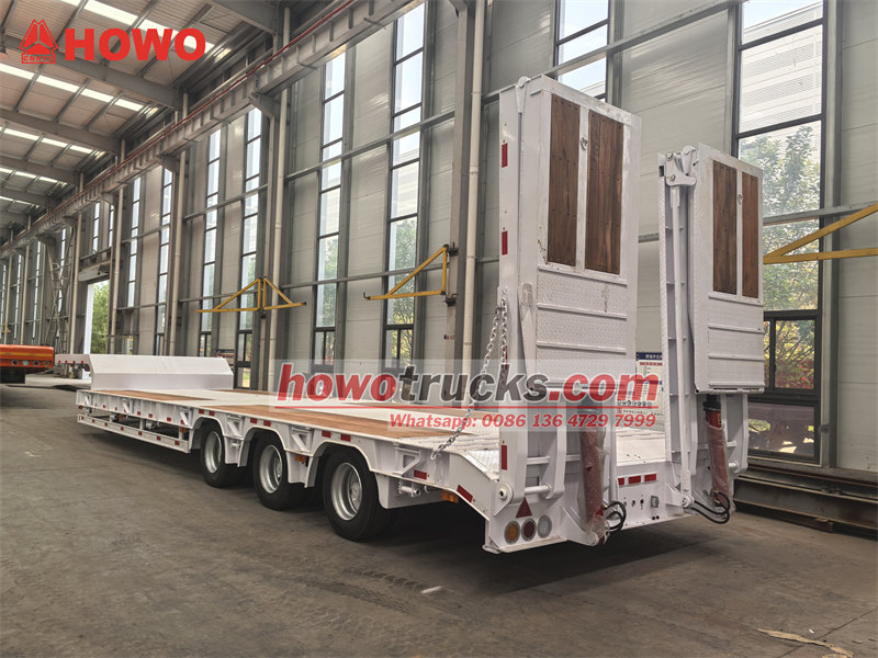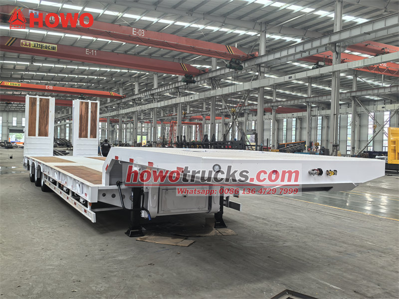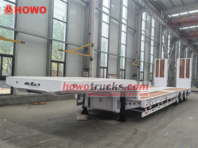 45-тонний 3-вісний низькорамний причіп – це транспортний засіб, спеціально розроблений для перевезення великогабаритної техніки та обладнання. Він оснащений п'ятозчіпним зчіпним пристроєм JOST 50# та пневматичною підвіскою з підйомником передньої осі, а також трьома 13-тонними самокерованими осями. Причіп оснащений гальмівною системою WABCO EBS для забезпечення безпеки руху. Спеціально розроблені гідравлічні пандуси та платформна платформа мають спеціальне дерев'яне покриття, що забезпечує чудовий протиковзкий захист. Порівняно зі звичайними моделями, його самокеровані осі ефективно зменшують знос шин, а функція підйому пневматичної підвіски покращує прохідність без вантажу. Дерев'яна платформа допомагає мінімізувати опір тертю та підвищує ефективність завантаження та розвантаження.