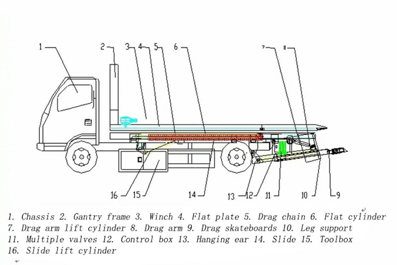 ●Надбудова плоскої евакуаторської вантажівки в основному складається з опорного стріли, платформи, лебідки, гідравлічної системи, допоміжних виносних опор та пристроїв керування.