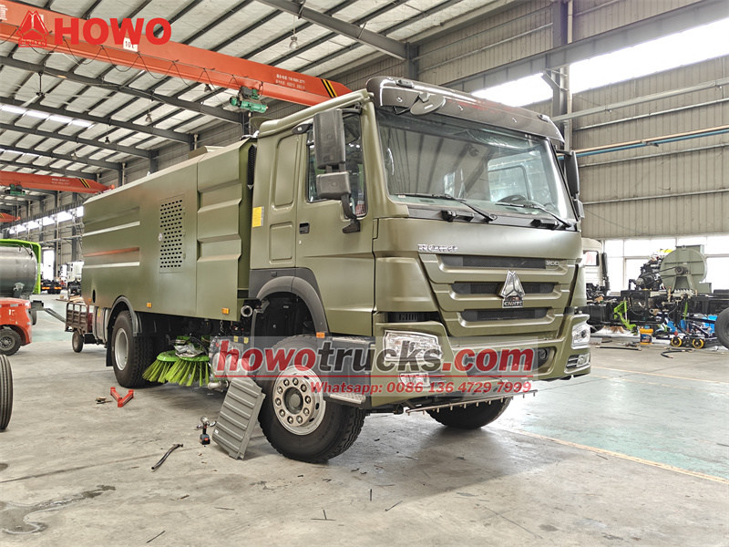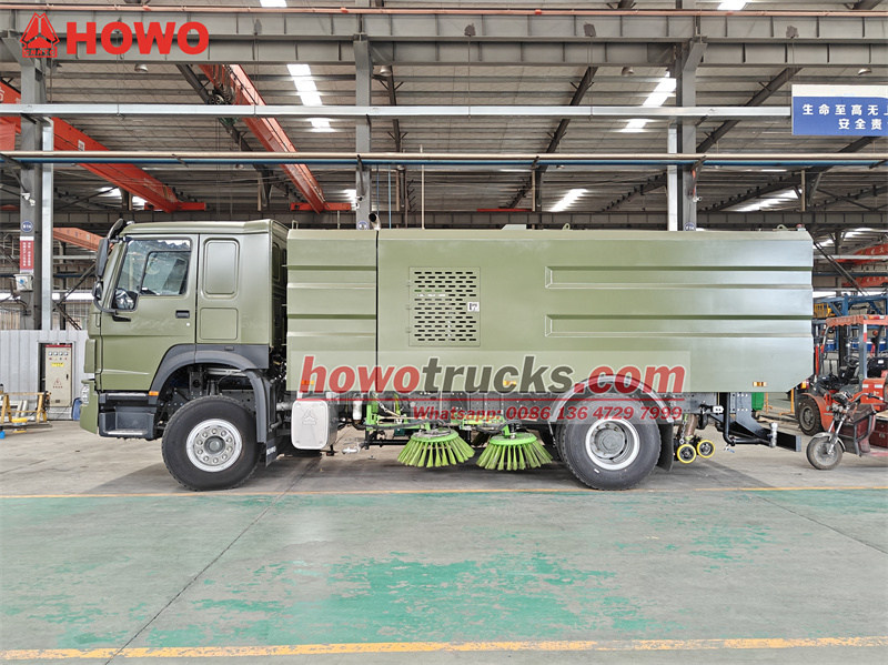Підмітально-прибиральна машина HOWO 12 куб. м. модифікована на базі шасі кабіни HOWO HW76. Вона має колісну базу 4600 мм та оснащена двигуном Weichai WP10.300E22, коробкою передач Sinotruk HW19710, резервуаром для води з вуглецевої сталі об'ємом 4000 літрів, внутрішнім та зовнішнім сміттєвими баками з нержавіючої сталі об'ємом 8000 літрів та допоміжним двигуном Dongfeng Cummins B140 33. Машина оснащена чотирма щітками для підмітання та присоском, повітродувкою Weiye, німецьким плунжерним насосом високого тиску PINFL PF36 (1150 об/хв) та водяним насосом низького тиску Hangzhou Weilong 60/90 (60 м).³/год). Перед кабіною розташовано кілька промивних форсунок, а перед підмітальною щіткою — розпилювальна форсунка. Ширина промивання водою під високим тиском становить 2,5 м, ширина захвату підмітальної щітки — 3,5 м, а максимальна продуктивність підмітання — 60 000 м.³/год. Швидкість підмітання становить 3-20 км/год. Транспортним засобом керує електронний блок керування в кабіні та блок керування роботою на всмоктувальному насосі.