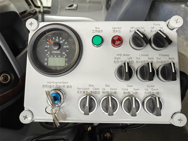Інтелектуальна електронна система керування об’єднує два пульти керування в кабіні та біля присосок, що дозволяє одним дотиком керувати такими функціями, як підйом та опускання щіток, розвантаження бака, а також запуск та зупинка повітродувки, забезпечуючи зручну та ефективну роботу. Цей транспортний засіб використовує модульну інтегровану конструкцію, яка об’єднує систему живлення, систему підмітання, систему водопостачання та інтелектуальну систему керування для досягнення ефективної, енергозберігаючої та екологічно чистої роботи.