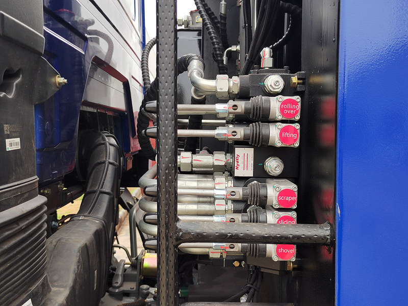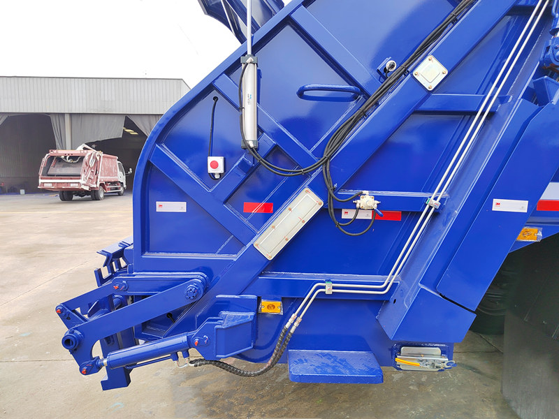 ♦Коли транспортний засіб прибуває на завод з переробки відходів, гідравлічна система змінює свою роботу на протилежний спосіб, натискаючи на штовхач, щоб викинути стиснуті відходи з кузова вантажівки.