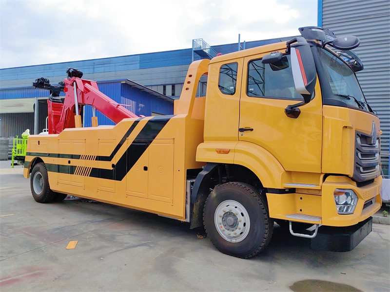 Хово 4x2Евакуатор оснащений надійною гідравлічною системою виносних опор (розрахованою на підйом 100,5 тонни на аутригер), що забезпечує широкий проміжок опори та гарантує безпеку й стійкість під час важких рятувальних операцій. Жовта розкішна кабіна з одним рядом і півтора спальними місцями (доступні й інші кольори), паливний бак великої місткості 400 літрів, електрична система 24 В, повний комплект сигнального освітлення (сигнальні вогні, стробоскопи), ящик для інструментів та інші аксесуари роблять його великомасштабним професійним буксирувально-рятувальним обладнанням з комплексним набором функцій та потужною продуктивністю.