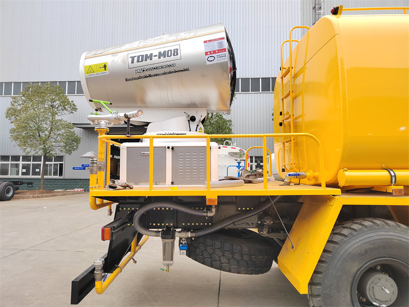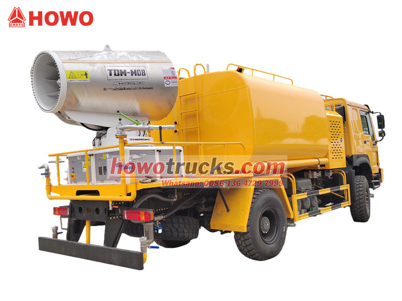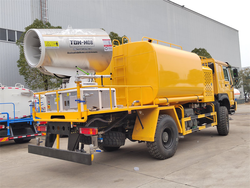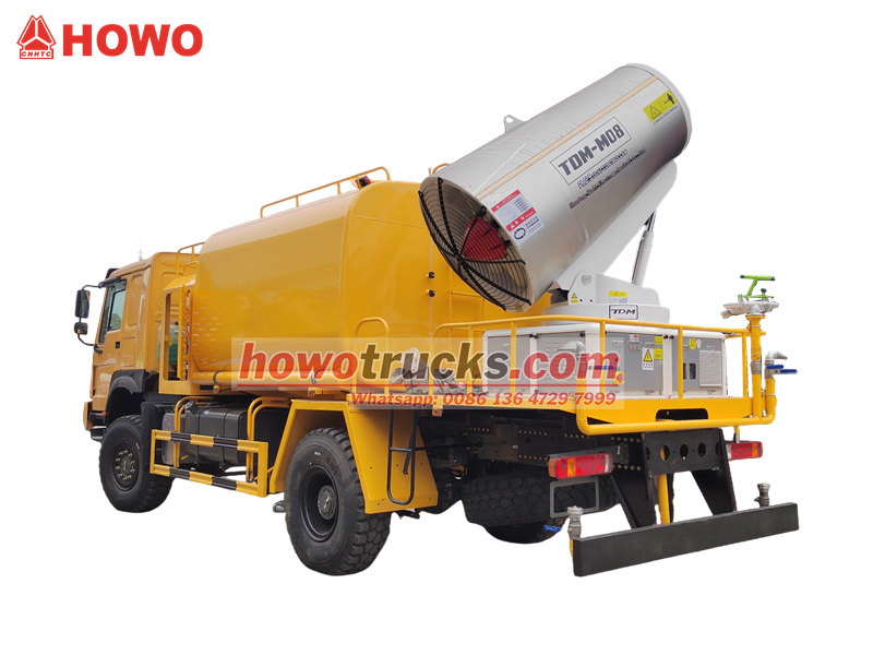 Водомет HOWO 4×4 побудований на повнопривідному шасі HOWO, оснащений двигуном потужністю 300 к.с. та системою повного приводу, що забезпечує видатну продуктивність на складній місцевості. Завдяки наддалекій дальності стрільби 80 метрів з 90 форсунками, він може розпилювати дрібний водяний туман (20-200 мкм) з максимальною площею покриття 20 000 кв. футів. У поєднанні з резервуаром для води великої місткості 10 000 літрів та системою розпилення високого тиску, він ефективно виконує такі завдання, як зменшення пилу на дорогах, пилопридушення на будівельних майданчиках та сільськогосподарське обприскування. Він особливо підходить для боротьби з пилом у гірничодобувних районах, портах, для захисту міського середовища та інших галузях.