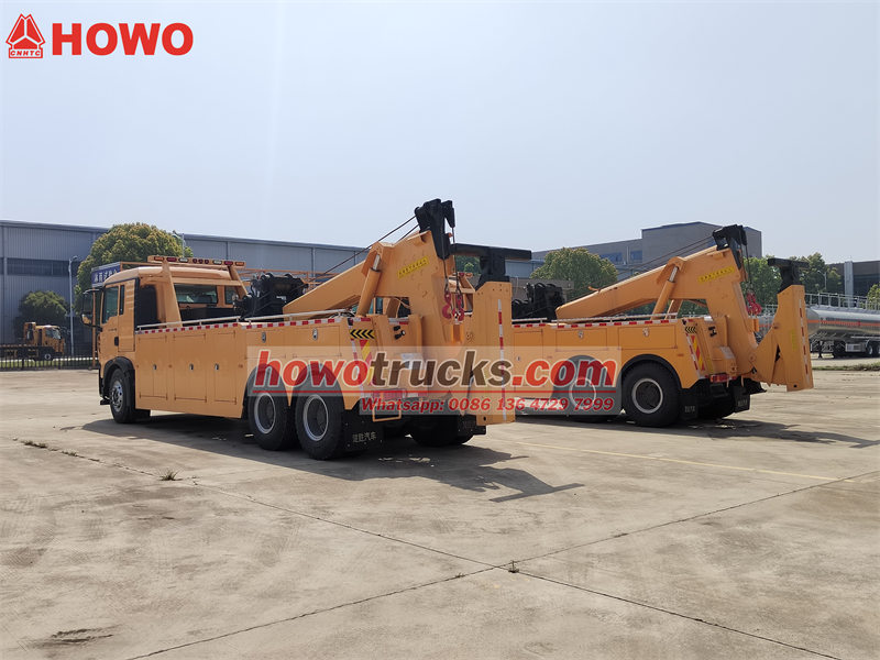 Евакуатор Howo 6x4 оснащений надійною гідравлічною системою виносних опор (розрахованою на підйом 12,5 тонн на виносну опору), що забезпечує широкий проліт опори та гарантує безпеку й стійкість під час важких рятувальних операцій. Жовта розкішна кабіна з одним рядком і півтора спальними місцями (доступні й інші кольори), паливний бак великої місткості 400 літрів, електрична система 24 В, повний комплект сигнального освітлення (сигнальні вогні, стробоскопи), ящик для інструментів та інші аксесуари роблять його великомасштабним професійним буксирувально-рятувальним обладнанням з комплексним набором функцій та потужною продуктивністю.