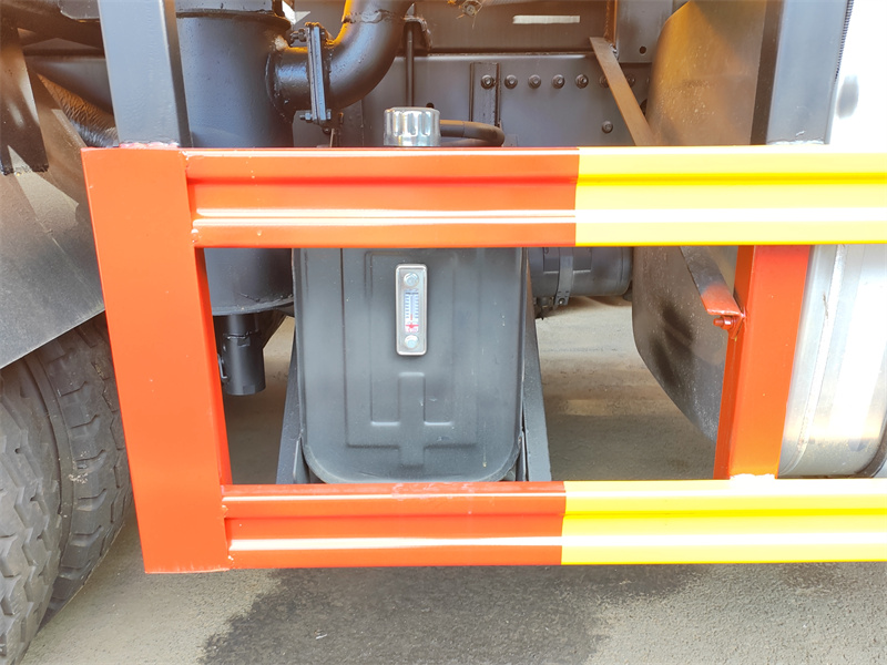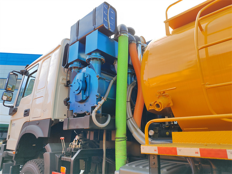 Транспортний засіб Howo для відсмоктування стічних вод оснащений баком для гідравлічного масла, випускним клапаном, вакуумним насосом для циркуляції води SK-15, трубою для всмоктування та випускання стічних вод, насосом для очищення високого тиску, котушкою для очищення високого тиску, сепаратором водяної пари, сепаратором нафти та газу, вікном для контролю рівня рідини та драбиною.