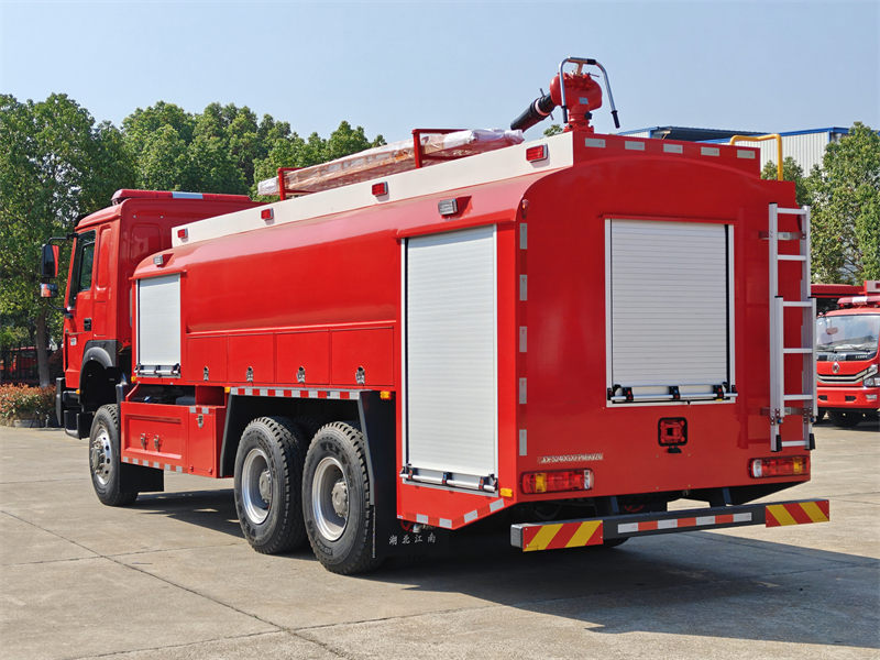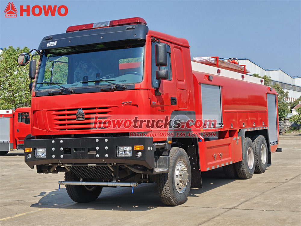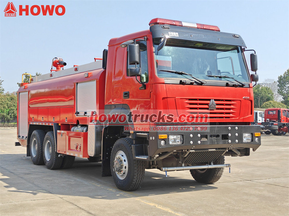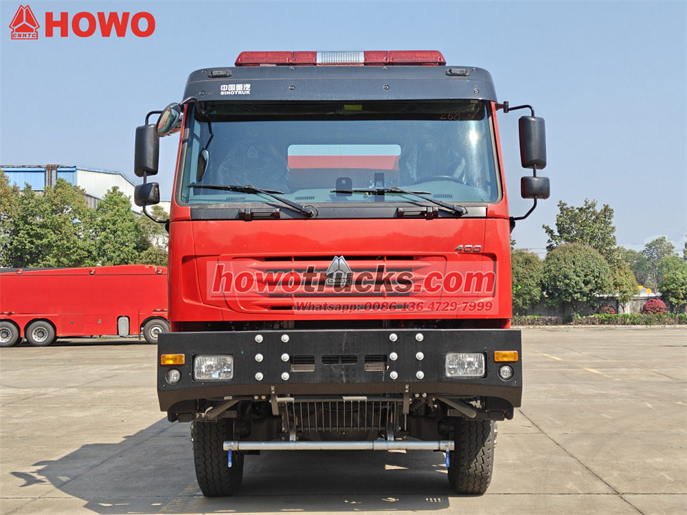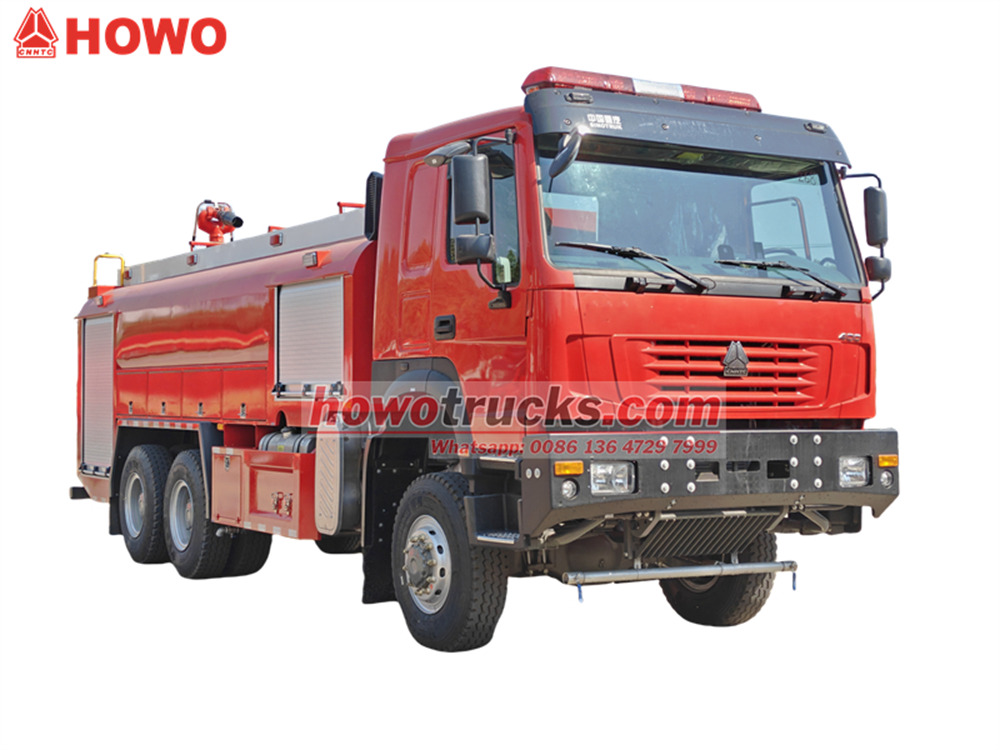 The Пожежна вантажівка Howo використовує важке шасі Sinotruk з колісною формулою 6x6. Вона оснащена...WP12S400 E201 Двигун номінальною потужністю 400 кінських сил та механічна коробка передач з 12 передачами вперед та 2 передачами назад. Пожежна автоцистерна Howo 6x6 має місткість бака 8000 літрів води та 1500 літрів піни та виготовлена з композитного матеріалу PP з антикорозійними властивостями. На даху встановлено пожежний лафет з витратою 45 л/с та дальністю дії понад 55 метрів.