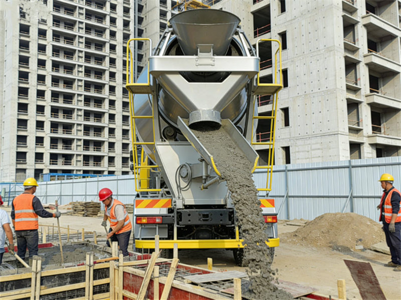▶ Розрядка: Коли вантажівка прибуває на будівельний майданчик, бетон вивантажується з барабана шляхом його обертання у протилежному напрямку. Бетон вивантажується через жолоб, розташований у задній частині вантажівки, і може бути спрямований у потрібне місце.