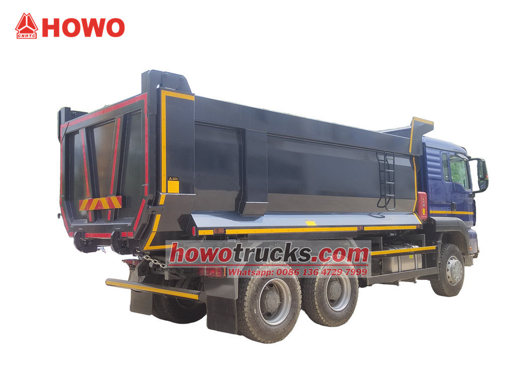 Самоскид HOWO TX Cabin Dump Tipper виготовлений на базі шасі HOWO TX Cabin 6x4 з колісною базою 3200+1400 мм, оснащений дизельним двигуном WP10.380E22 потужністю 380 к.с., коробкою передач HW19710, 10-ступінчастою передачею вперед, 2-ступінчастою передачею назад та самоскидним кузовом з вуглецевої сталі з товщиною бічної стінки 6 мм та товщиною днища 8 мм. 5200x2300x1400 мм, підйом спереду зверху, стабільний підйом, чисте та швидке розвантаження, задні двері можна відкривати, а транспортний засіб керується за допомогою регулювального клапана з боку водія, який простий в експлуатації.