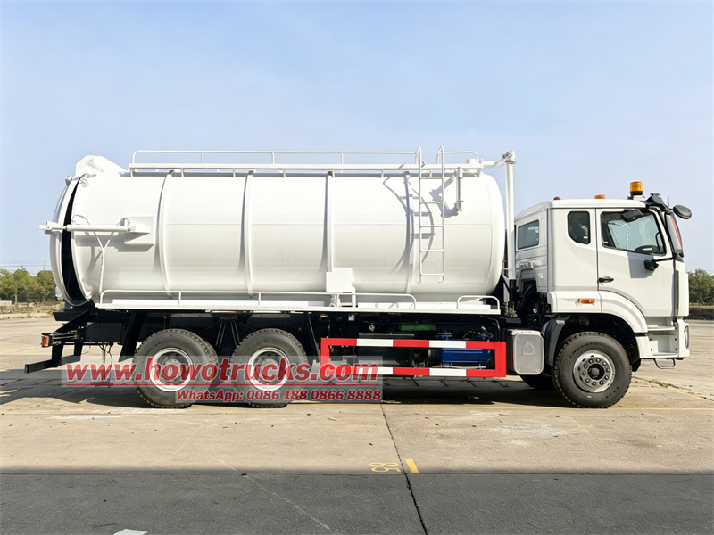 16000*2This Nigeria HOWO NX septic tanker cleaning truck is a specialized vehicle designed for Nigeria heavy-duty sewage suction operations. Based on the Sinotruk HOWO NX400 chassis, it integrates a 20 cubic meter sewage suction tank and a 2BE-204 water circulation vacuum pump, enabling efficient sewage suction. This truck features self-priming and self-discharging capabilities, a large capacity, convenient transportation, and a powerful vacuum pump with a long suction range, making it suitable for heavy-duty operations such as urban pipe network dredging and septic tank cleaning.