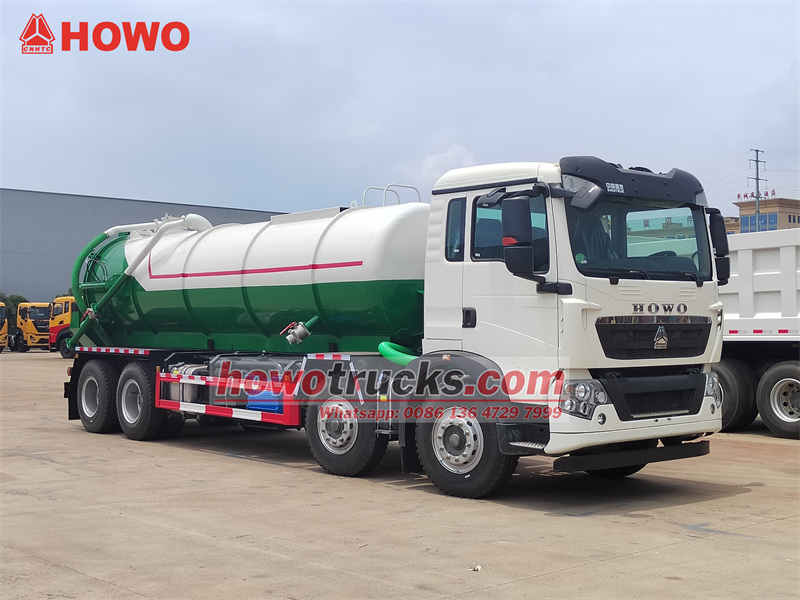 17500Вакуумний автоцистерна HOWO TX 25000L – це спеціалізований санітарний автомобіль, призначений для ефективного всмоктування, транспортування та утилізації рідких відходів і шламу. Побудований на шасі важкої вантажівки HOWO TX 8×4, він оснащений двигуном потужністю 350 кінських сил і 10-ступінчастою коробкою передач HW19710, а також великим паливним баком об'ємом 400 літрів. Надбудова включає вакуумний бак об'ємом 25 кубічних метрів, виготовлений з високоякісної вуглецевої сталі товщиною 6 мм, інтегрований з водокільцевим вакуумним насосом SK-20, здатним досягати максимальної швидкості всмоктування 20 м³/хв і максимального рівня вакууму 8300 Па, що забезпечує потужне всмоктування та стійкість до корозії.