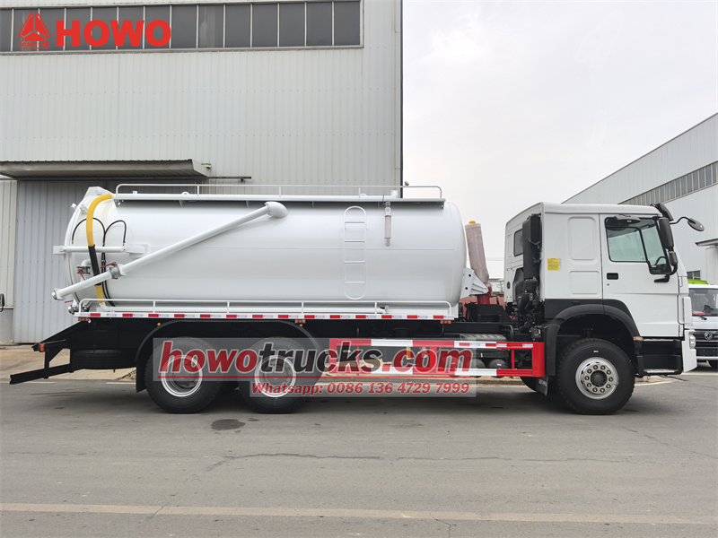 Вантажівка для відкачування стічних вод HOWO 6x4 об'ємом 15 куб. м. модифікована на шасі кабіни HOWO HW76. Колісна база 4600+1350 мм, оснащена двигуном Weichai WP10.340E22 та 10-ступінчастою коробкою передач Sinotruk HW19710. Верхня частина кузова являє собою резервуар для стічних вод об'ємом 15 куб. м., виготовлений з вуглецевої сталі, товщиною 5 мм. Резервуар можна підняти, а задній борт можна відкрити за допомогою вакуумного насоса Jurop PN106D з продуктивністю 11 000 л/хв. Транспортний засіб також оснащений оглядовою трубою, драбиною, випускним клапаном заднього борту та ручним гідравлічним важелем з боку водія (для керування відкриттям/закриттям заднього борту та підйомом/опусканням резервуара).
